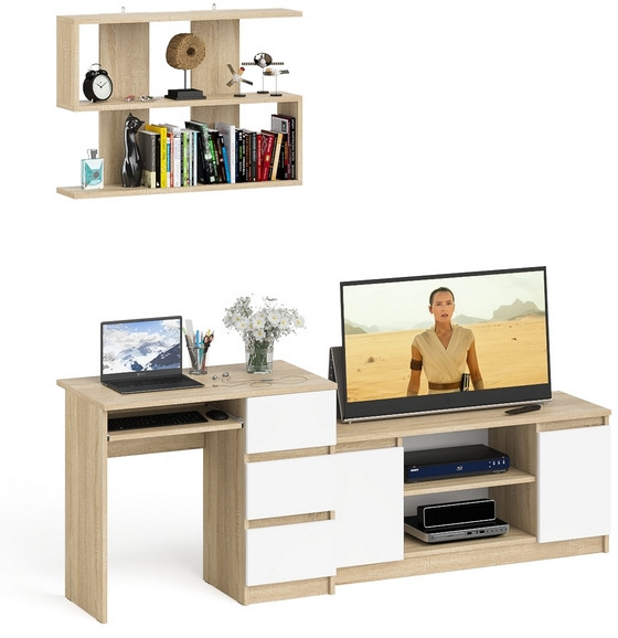 МС-6 стол ящики справа с тумбой Мори 1200-1 и полкой на 900. Цвет - дуб сонома/белый. Габариты (ШхГхВ) 210,4х50х209,6 см. Не универсальная сборка. Стол с тумбой справа и выдвижной панелью для клавиатуры. Тумба состоит из открытой ниши по центру и 2 закрытыми распашными дверками по краям. 3 полки с боковыми стенками по диагонали соединеных 2 задними панелями.